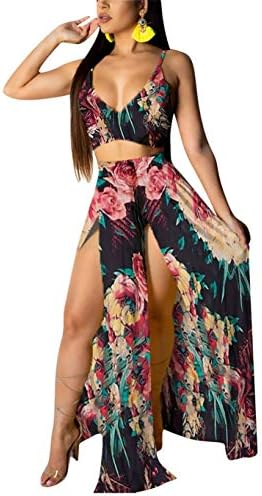 EOSIEDUR Women's Chiffon Bohemian Floral Printed 2 Piece Sets Crop Cami Top & Split Beach Party Maxi Dress