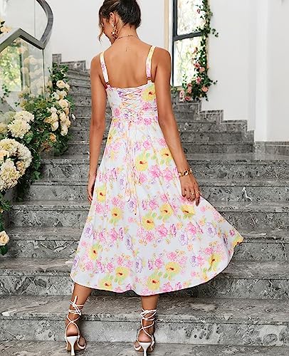 Floral Midi Corset Dress Boho Flowy Slit Lace Up Dresses for Women Going Out A Line Casual Sundress