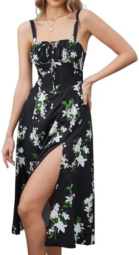 Floral Midi Corset Dress Boho Flowy Slit Lace Up Dresses for Women Going Out A Line Casual Sundress