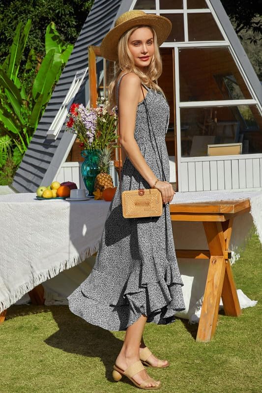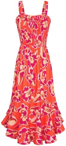 Women's Summer Casual Chiffon Dress Strap Tie Front Square Neck Long Dresses