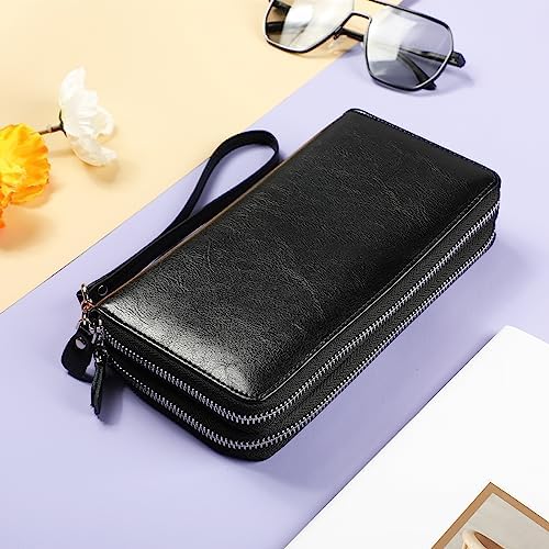 GOIACII Women's Wallet Large Capacity Double Zip Around Credit Card Holder Leather Ladies Wallet with RFID Blocking Phone Wristlet Purse Black