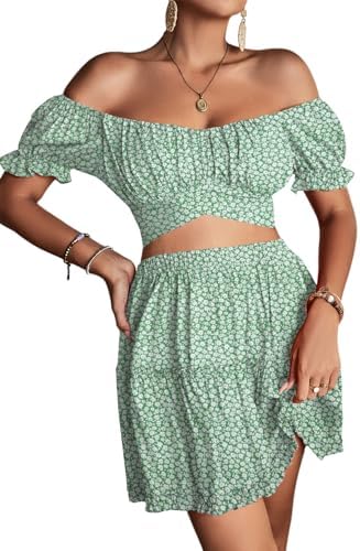 LYANER Women's 2 Piece Outfits Floral Off Shoulder Tie Up Crop Top and Mini Skirt Set
