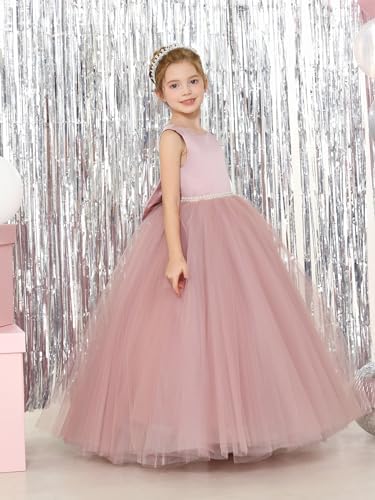MCieloLuna Flower Girls Satin Tulle Princess Pageant Dress for Wedding Kids Pearls Prom Ball Gowns with Bow-knot