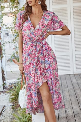 PRETTYGARDEN Women's 2024 Floral Boho Dress Wrap V Neck Short Sleeve Belted Ruffle Hem A-Line Flowy Maxi Dresses