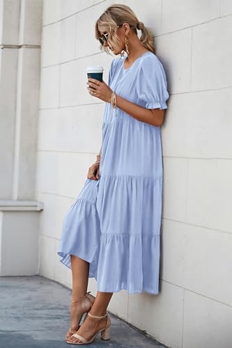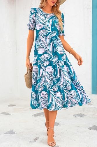 PRETTYGARDEN Women's Summer Casual Boho Dress Floral Ruffle Puff Sleeve High Waist Midi Beach Dresses