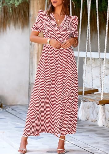 PRETTYGARDEN Womens Summer Wrap Maxi Dress Casual Boho Floral V Neck Short Sleeve Ruffle Hem Split Beach Long Dresses
