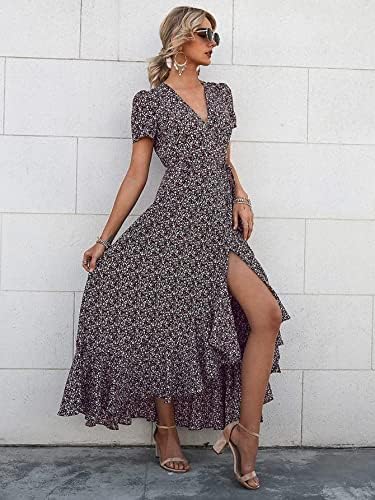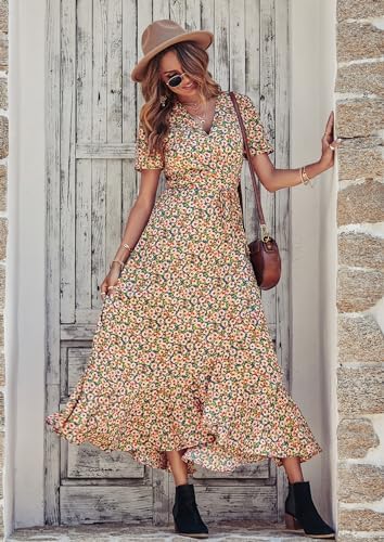 PRETTYGARDEN Womens Summer Wrap Maxi Dress Casual Boho Floral V Neck Short Sleeve Ruffle Hem Split Beach Long Dresses
