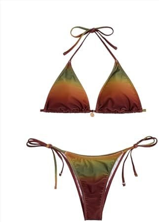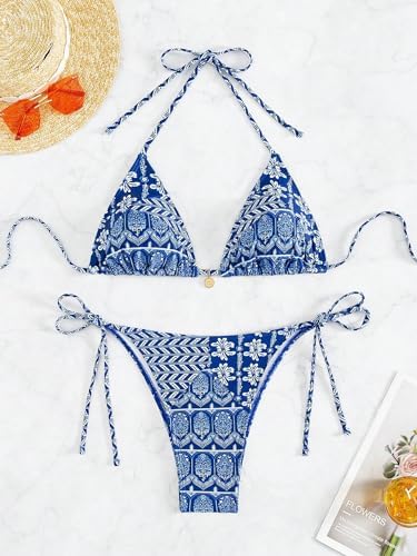 VOLAFA Women's Triangle Bikini Set String Swimsuit Print Tie Smocked Ruched Two Piece Bathing Suit
