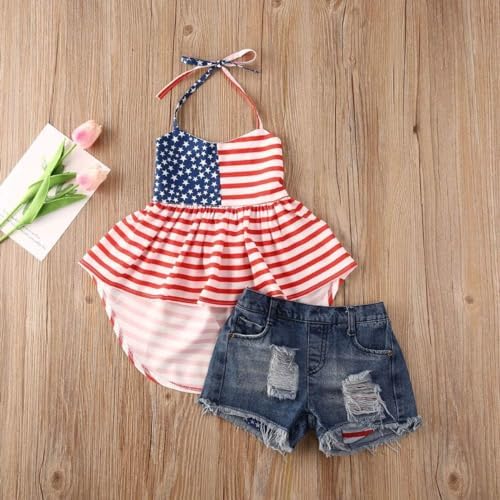 Toddler Baby Girl Fourth of July Outfits Halter Star Top + Ripped Hole Denim Shorts Kids 4th of July Clothes Set