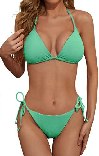 Women's Two Piece Bikini Swimsuit Sexy Ribbed Triangle Top Bathing Suits String Cheeky Bikini Sets